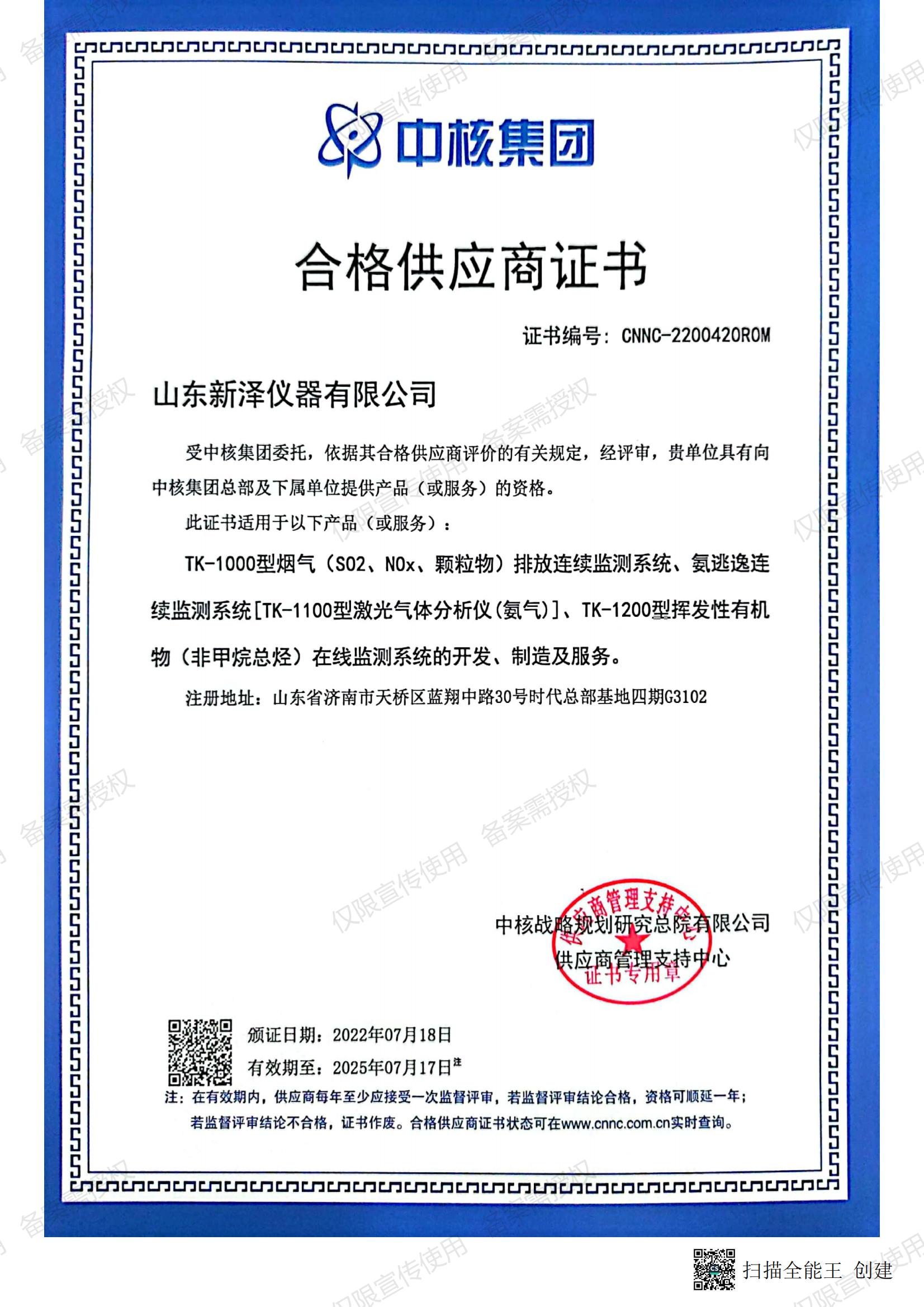 歷經(jīng)中核評審組兩月全面、系統(tǒng)的審查,公司順利通過2022年度中核集團(tuán)合格供應(yīng)商評審,成為“中核集團(tuán)合格供應(yīng)商",此后我們可以根據(jù)產(chǎn)品范圍,參與中核集團(tuán)項目。