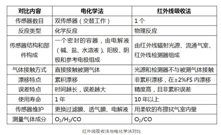 CO氣體檢測(cè)的主要方法有:紅外線(xiàn)吸收法、電化學(xué)法、電氣法(熱導(dǎo)式和半導(dǎo)式)、色譜法,目前CO氣體濃度在線(xiàn)檢測(cè)通常使用紅外線(xiàn)吸收法、電化學(xué)法。