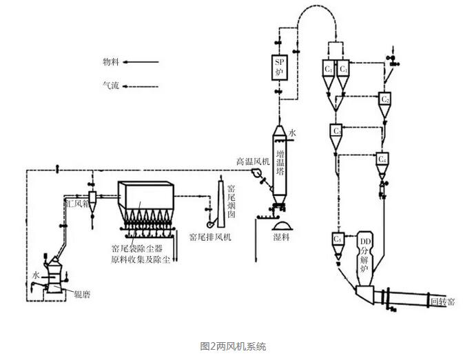 兩風(fēng)機(jī)系統(tǒng)是三風(fēng)機(jī)系統(tǒng)的簡化,生料磨采用輥磨時(shí)非常合適,它簡化了工藝,設(shè)備布局緊湊,投資低。但三風(fēng)機(jī)變?yōu)閮娠L(fēng)機(jī)系統(tǒng)后,系統(tǒng)設(shè)備負(fù)壓明顯提高,系統(tǒng)對(duì)設(shè)備漏風(fēng)更為敏感,需要更嚴(yán)格管理。兩風(fēng)機(jī)系統(tǒng)實(shí)際應(yīng)用偏少,但在我國以海螺集團(tuán)為代表的水泥生產(chǎn)線上卻有大量應(yīng)用。實(shí)踐表明,生產(chǎn)管理得好時(shí),兩風(fēng)機(jī)系統(tǒng)會(huì)比三風(fēng)機(jī)系統(tǒng)節(jié)能。