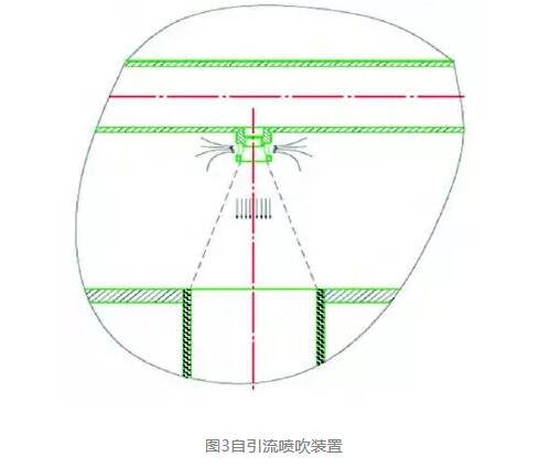 2001年,我們開始研究行噴脈沖清灰長袋袋收塵器。除塵器的新結(jié)構(gòu)采用自引流脈沖噴吹裝置(非文氏管)(圖3)和長袋分排清灰,將袋長由3m加長到6m以上,基本解決了袋長限制。