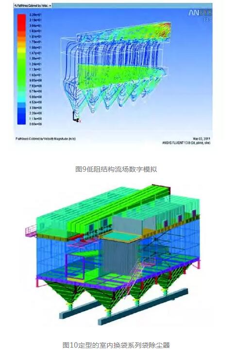 實(shí)際上,該綜合平臺(tái)是我們?cè)谏a(chǎn)過程中分段研發(fā)的。首先通過數(shù)字流場(chǎng)計(jì)算的模擬,確定了公司標(biāo)準(zhǔn)袋除塵器系列及多種非標(biāo)改造的低阻結(jié)構(gòu)(圖9、10)。