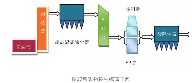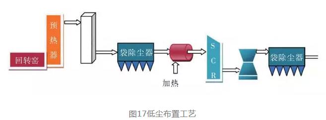 圖17為傳統(tǒng)的低塵布置工藝,采用傳統(tǒng)的高溫袋除塵器可以保證進(jìn)入SCR反應(yīng)器的廢氣含塵量極低,這樣粉塵對(duì)SCR催化劑的影響小。但由于傳統(tǒng)濾袋的耐溫限制,通常需要采用六級(jí)預(yù)熱器,或優(yōu)先通過SP余熱鍋爐降溫,或采用增濕塔將預(yù)熱器出口廢氣溫度降低到≤280℃,并且不允許出現(xiàn)超溫事故。降溫除塵后,為了滿足氮氧化物最佳催化還原反應(yīng)溫度,需要對(duì)煙氣進(jìn)行再加熱,這無疑會(huì)使工藝復(fù)雜且有能源消耗。如果研發(fā)出有效可靠的低溫催化劑,無需對(duì)氣體再加熱,則是一個(gè)理想的選擇。