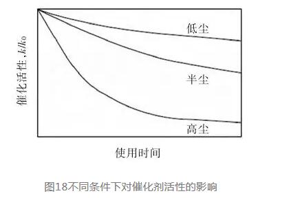 國外有關(guān)研究實(shí)驗(yàn)結(jié)果給出了催化劑活性使用壽命與氣體含塵量的關(guān)系(見圖18)。由此可見,氣體含塵量高會(huì)大大縮短水泥SCR脫硝催化劑的使用壽命,水泥窯尾的高塵布置方案會(huì)更糟。