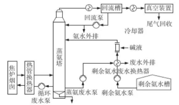 以焦?fàn)t煙道廢氣為熱源的負(fù)壓蒸氨工藝流程:剩余氨水經(jīng)換熱器換熱后送入蒸氨塔進(jìn)行蒸餾,蒸氨塔頂氨汽經(jīng)分縮器、冷卻器冷卻后,冷卻氨水進(jìn)入回流槽,槽頂不凝汽在真空裝置吸力作用下,經(jīng)冷卻器冷卻后進(jìn)入吸煤氣管道中;槽底氨水用回流泵抽出,一部分送蒸氨塔頂回流,一部分作為產(chǎn)品氨水外送。蒸氨塔底蒸氨廢水進(jìn)入煙氣熱管換熱器循環(huán)加熱后返回蒸氨塔內(nèi);另一部分蒸氨廢水與原料剩余氨水換熱降溫后送廢水處理裝置。其工藝流程圖如圖5所示。